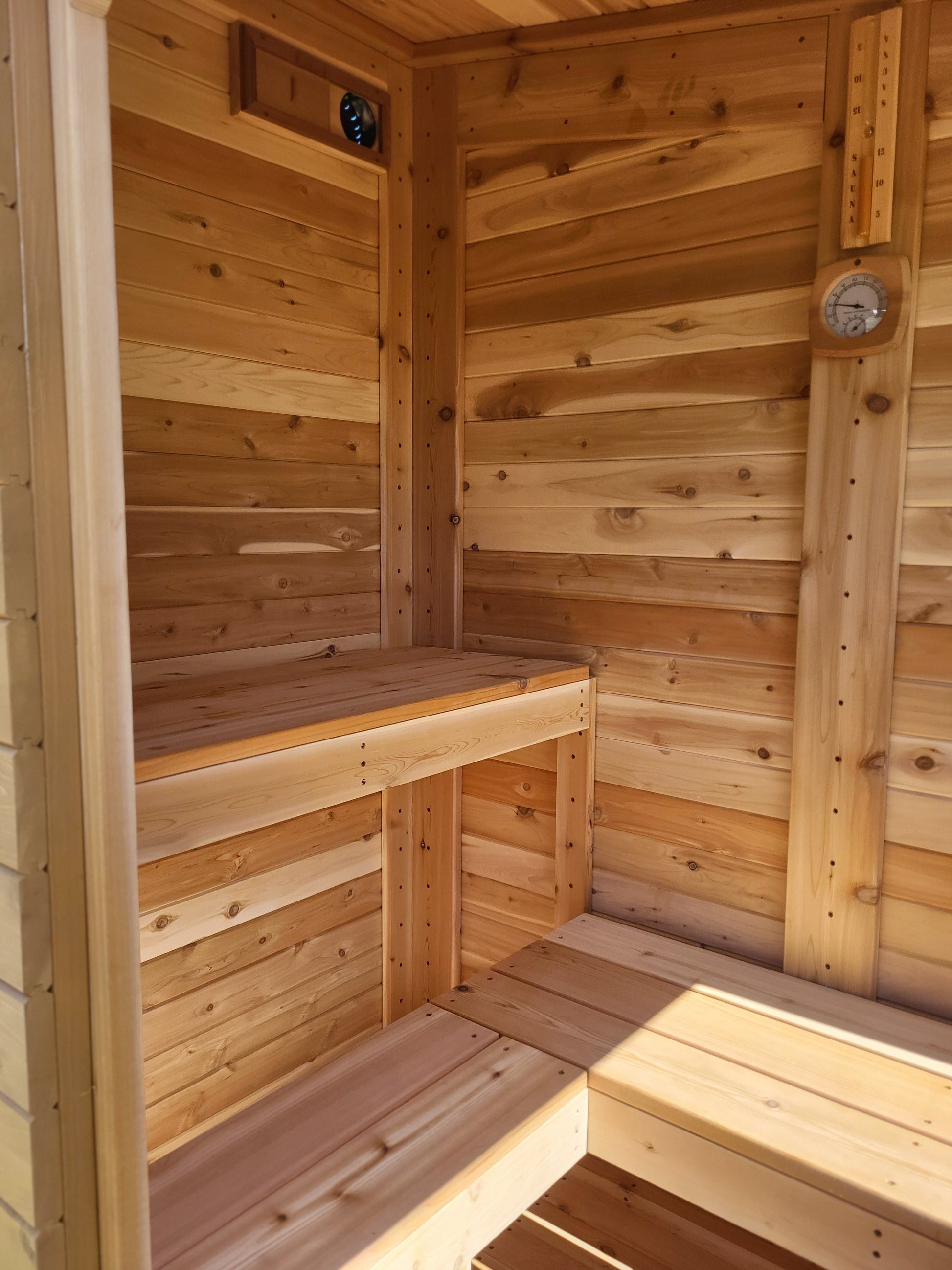 Additional L-shaped bench can be added as either an upper (can accommodate laying down) or lower bench (allows for additional sauna capacity) at a cost of $300 + hst.